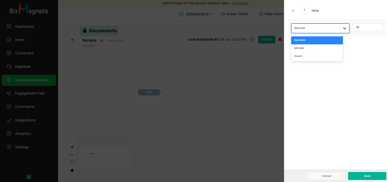 Sometimes, you may want to wait more than a few seconds for the user's response before sending the next message. This is where the Delay Card in BizMagnets comes into play, allowing you to introduce delays of several minutes or even hours. Make sure your session TTL is longer than the delay time.&#x20;