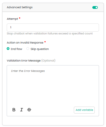 6. For the validation settings, you can set the attempt limit to 1. The Validation Error Message is optional. Specify the Action on Invalid Response, and enable the Additional Validation Settings.