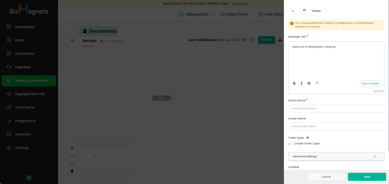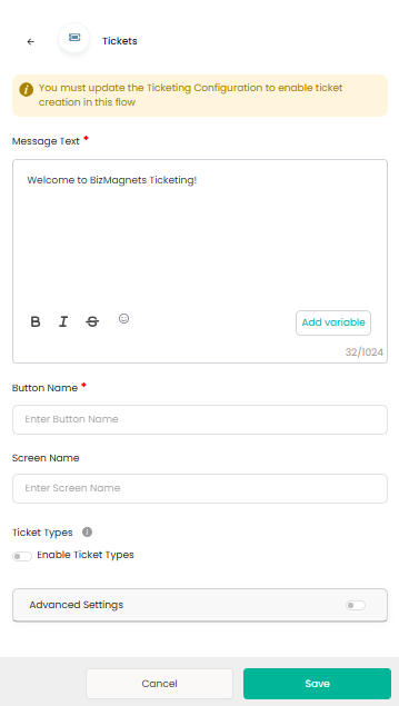 By following these steps you can prepare the Ticket Flow Card, enabling your bot to initiate the ticket creation process for users interacting with it. Remember to test your flow thoroughly to ensure it functions as expected.