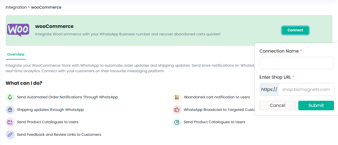 1. Go to Integrations in the left-hand menu. Hover over WooCommerce Integration from the available applications and click Connect.