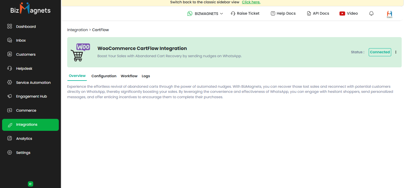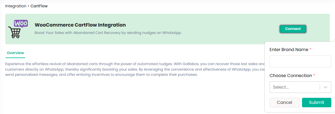 1. From the left navigation, go to Integration and select Cart Flow from the available apps.