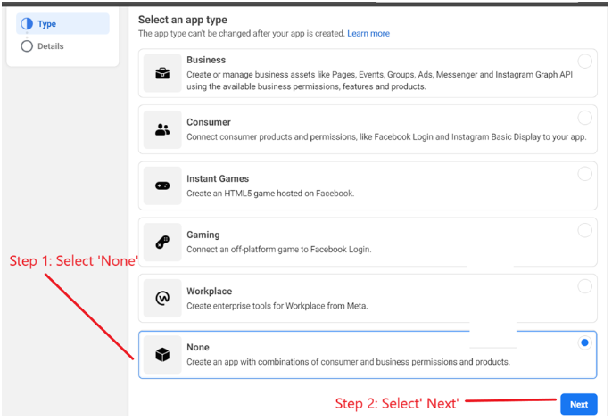 9. After clicking on 'Create App', you'll need to choose the type of app you are creating. Since this app is solely for enabling verification of your Facebook Business Manager account, select 'None' from the options provided and then click 'Next'.
